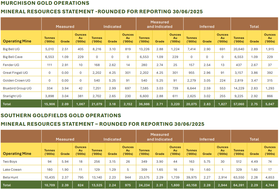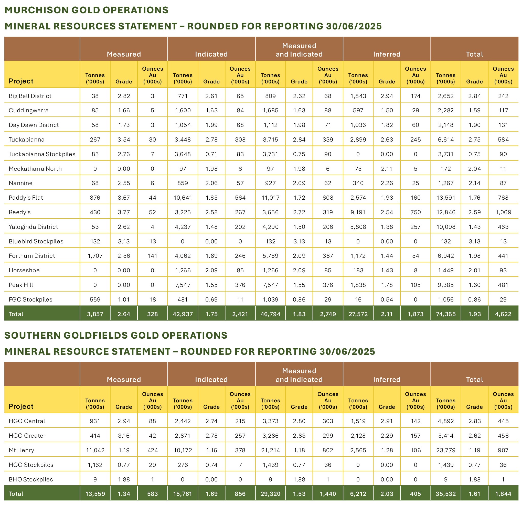 Table 1 - Gold Mineral Resource Estimates at 30 June 2025 for Westgold Operating Mines