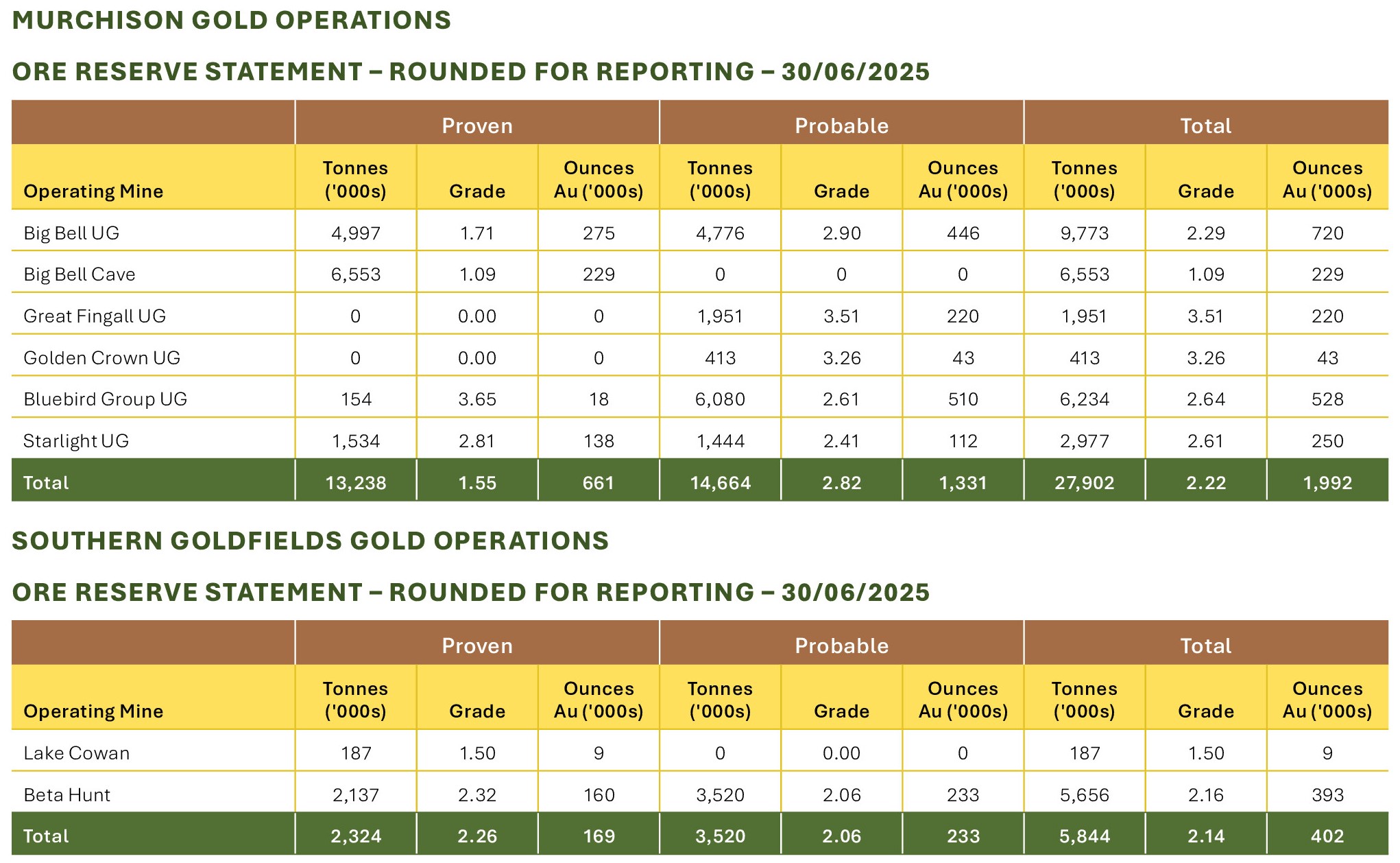 Table 4 - Gold Ore Reserves at 30 June 2025 for Westgold Operating Mines