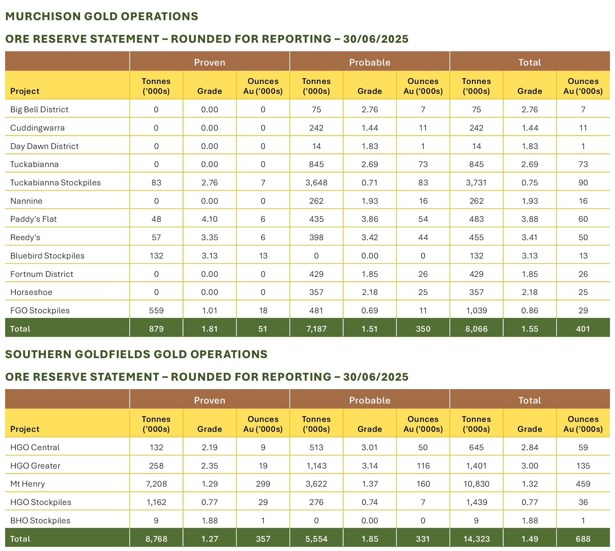 Table 4 - Gold Ore Reserves at 30 June 2025 for Westgold Operating Mines